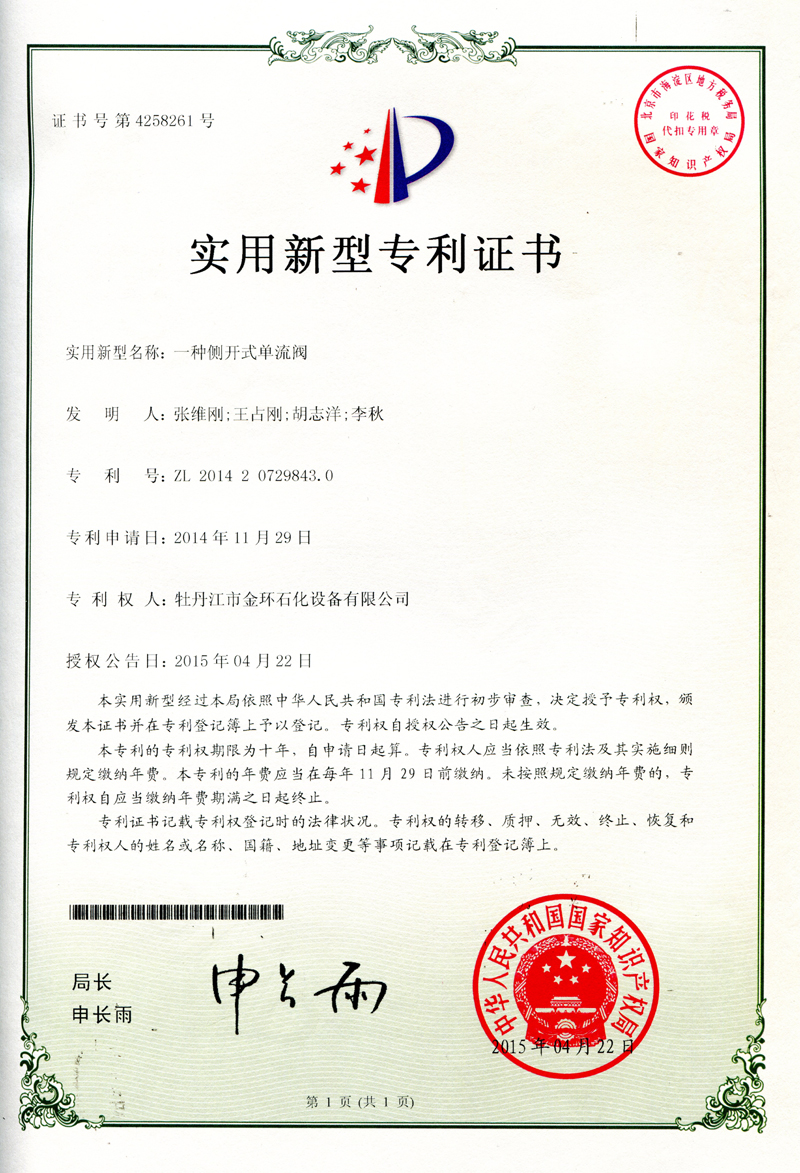 一種側開式單流閥實用新型專利證書ZL 2014 2 0729843.0