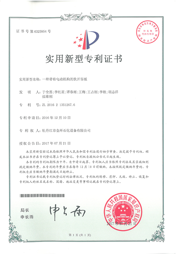 一種帶有電動(dòng)機(jī)構(gòu)的快開(kāi)盲板實(shí)用新型專利證書(shū)ZL 2016 2 1351267.6